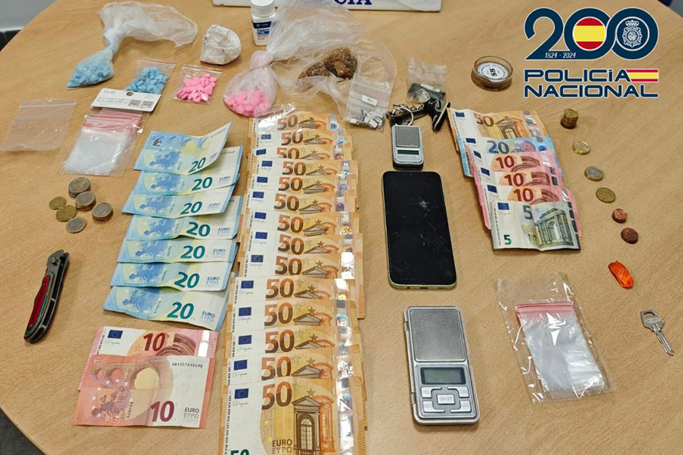 Como resultado de la actuación, los agentes intervinieron una importante cantidad de sustancias estupefacientes, entre ellas pastillas de MDMA, cocaína, éxtasis, LSD y hachís, así como dinero en efectivo, básculas de precisión, numerosas bolsas de plástico con autocierre, una navaja metálica y otros efectos relacionados con la distribución de drogas.