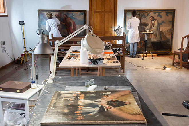 A partir de aquí, las fases de restauración pasan primero por la conservación de la obra y los materiales que aún mantiene, lo que se denomina consolidación: “Se trata de evitar que siga deteriorándose, que no caiga pintura; esto se consigue aplicando protección y con un trabajo de presión, peso y aplicación de calor o de injertos de tela o papel japonés, para evitar las pérdidas”, explica la restauradora de forma resumida. En el caso de las obras restauradas del Valle de Santa Inés, este trabajo ya se había realizado en una restauración anterior (20 años atrás), lo que permitió que la consolidación en esta nueva fase de restauración fuera más sencilla.