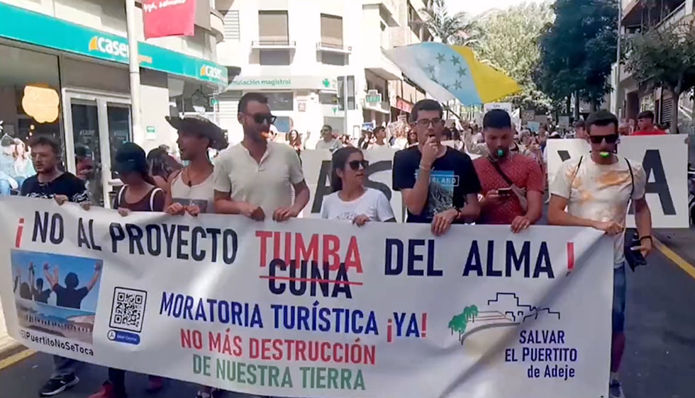 En Tenerife, el proyecto de urbanización del puertito de Adfeje es la gota que colma el vaso. Se protesta por esta urbanización de capital belga, de 420 villas y un hotel en una de las pocas playas que quedan en esa isla sin urbanizar, pero también por el Hotel de La Tejita, el circuito del motor, el Puerto de Fonsalía o los vertidos al mar. Se habla del destrozo del medio natural y no tanto de legalidad o ilegalidad. Se protesta por un modelo caduco, innecesario e ineficaz. No hace falta consumir más territorio para que los beneficios sean privados. Ya no cuela lo de la creación de empleo.