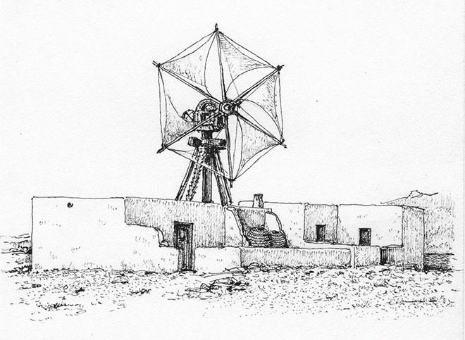 Dibujo de Santiago Alemán de la antigua molina de Caleta del Sebo. La imagen está incluida en la publicación ‘Arquitectura tradicional de Canarias. Un recorrido a través del dibujo’ (Ediciones Remotas).