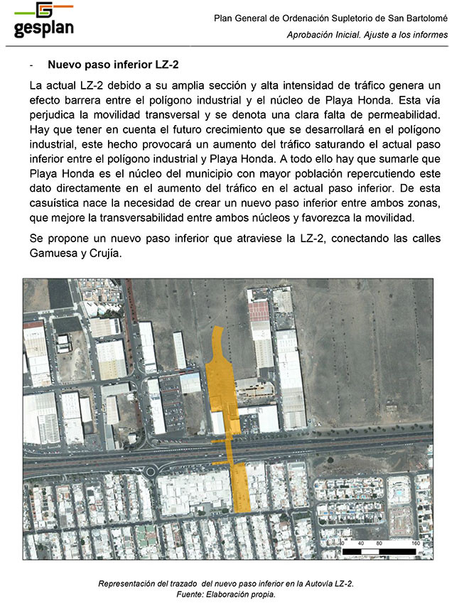 En el nuevo Plan General se parte de un diagnóstico evidente: la LZ-2, con su “alta intensidad de tráfico, genera un efecto barrera entre el polígono industrial y el núcleo de Playa Honda”. Su actual configuración “perjudica la movilidad transversal” y se aprecia “una clara falta de permeabilidad” entre ambos lados. De no tomar medidas, se advierte, el “futuro crecimiento” que se espera de la zona industrial y comercial provocará una mayor saturación de Playa Honda, donde además reside más de la mitad de la población del municipio.