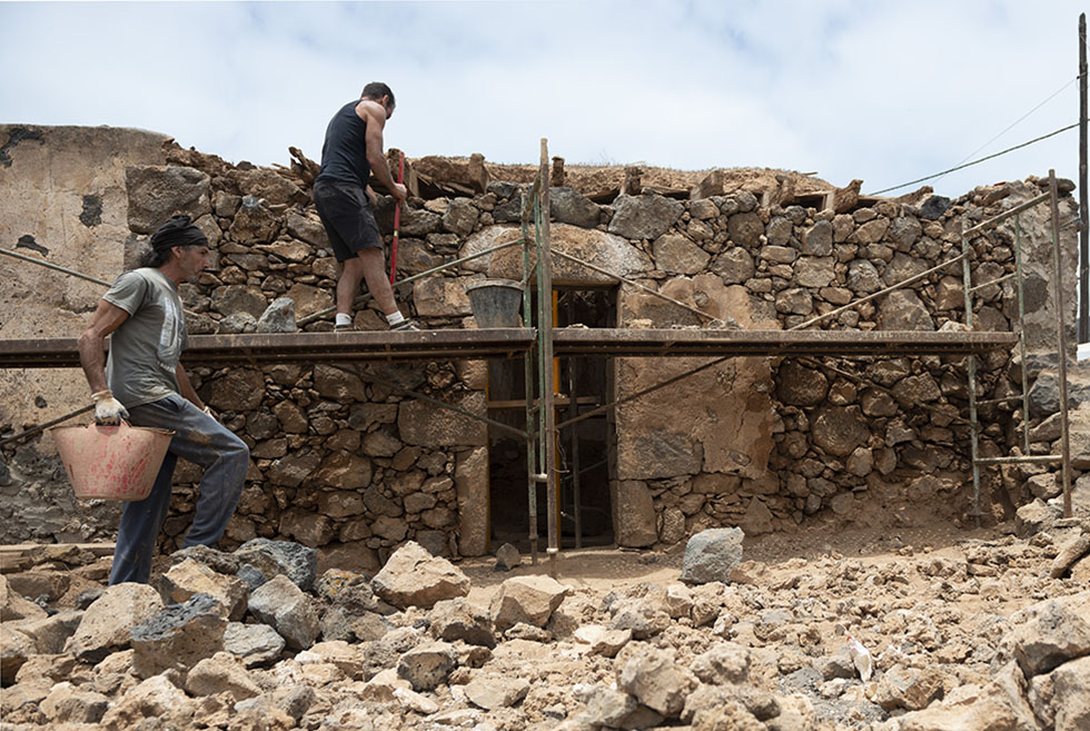 Aurelio, que trabaja la piedra, las va colocando una a una. Dice Perdomo que “cuando intervienes en una construcción así hay que hacerlo con la herramienta en una mano y el corazón en la otra”. “Con valor y con cariño”, añade.
