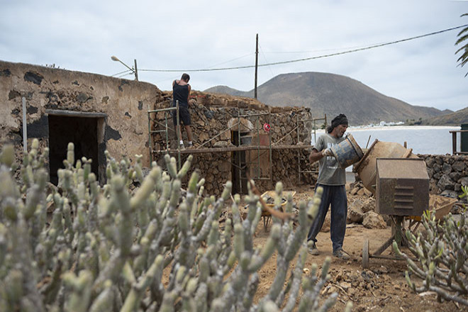 La construcción original tiene unos 300 años. Está en Máguez (Haría). Se usó como vivienda, pero después pasó a ser un corral. Sus habitantes eran, al menos, una vaca, un camello y varios cochinos. Son tres estancias con comederos, rodeadas por veroles. Con las lluvias más recientes, una de las paredes se vino abajo. Se trata de una herencia. Carlos Reyes, el propietario, podía haber optado por dejarla caer o por una ampliación, pero ha optado por restaurarla y “consolidar la ruina”.