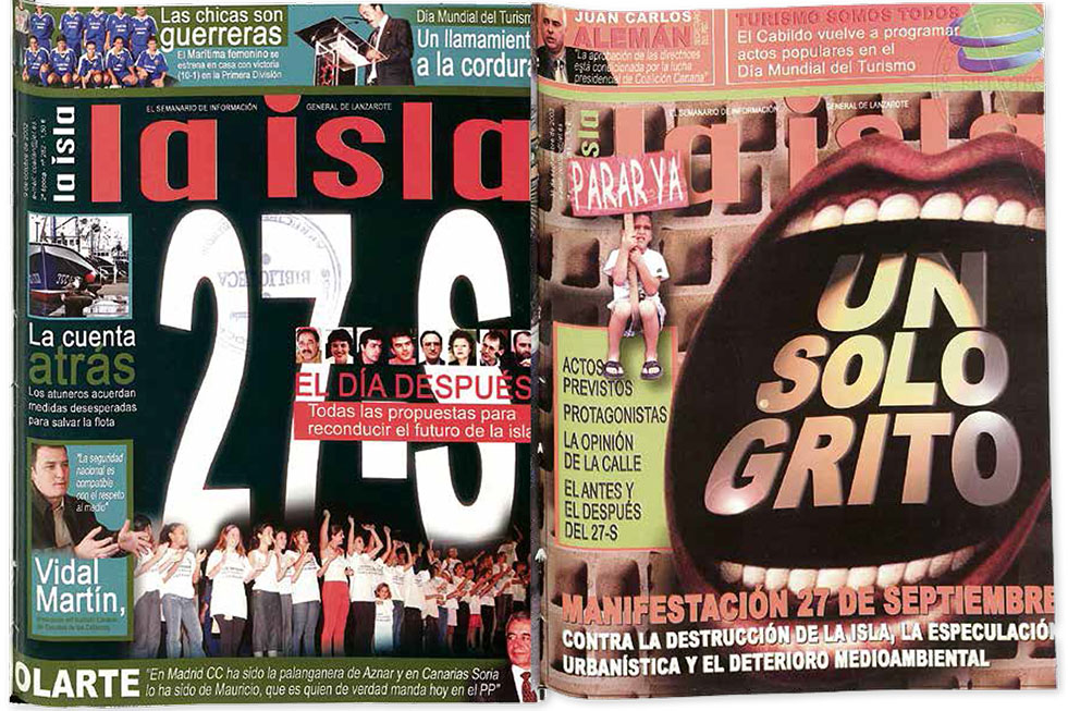 Lanzarote asistía a un auténtico boom de la construcción. O de la destrucción. Los hoteles se levantaban ya en Playa Blanca y Costa Teguise, pero había más amenazas al medio ambiente. En agosto de 2000 habían empezado las obras del puerto de Berrugo, en octubre de 2001 el Gobierno central había aprobado el primer decreto para las prospecciones petrolíferas, también se quería instalar un radar de aproximación aérea en Montaña Blanca, mientras que en Maciot se proyectaban seis campos de golf, en Playa Quemada dos hoteles y varios miles de camas en La Santa.