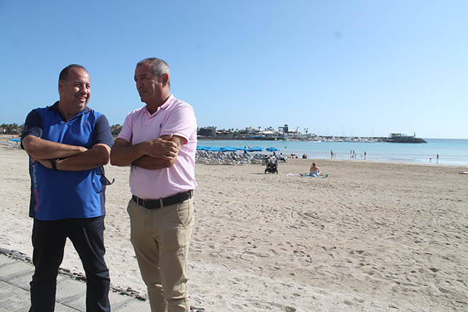 Las obras de regeneración de la Playa del Castillo avanzan y permiten la apertura de la mitad de la misma al uso y disfrute de los bañistas, afirma el alcalde de Antigua, Juan José Cazorla, que este lunes por la mañana visitaba junto al concejal de Playas, Hugo Flavio Estévez, el progreso de las obras.