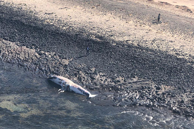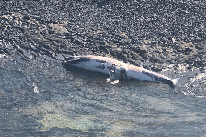 El cadáver de un cetáceo de grandes dimensiones ha llegado hasta la costa del sur de Fuerteventura. El helicóptero de la Guardia Civil ha sido el encargado de grabar las primeras imágenes después de que el animal quedara varado en la zona sur de Fuerteventura, concretamente en la Playa de la Turbia.