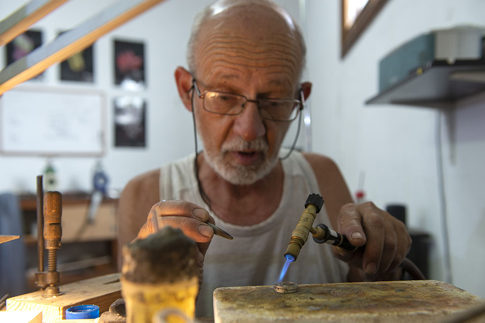 Mario Franceschin Cattaruzza es orfebre. Este venezolano lleva 32 años en Lanzarote. “Me empecé a dedicar a esto porque me permitía viajar e ir trabajando”. Comenzó cuando tenía 24 años y sigue adelante a sus bien llevados 67 años. Ante la pregunta de si se vive bien con este trabajo, devuelve la moneda: “¿Se vive bien de periodista?”, cuestiona. “Rico no soy, pero tengo cubiertas mis necesidades básicas. Me mueve más la pasión”, sentencia. Mario desliza