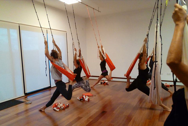 Cuelgan del techo los columpios que envuelven a los practicantes de yoga aéreo en las clases de Laura. Se asemejan a crisálidas a la espera de entrar en movimiento para desplegar brazos y piernas en suspensión, estirar todos los músculos, la piel y vencer miedos limitantes que impiden vivir con calidad. Y es que a los tradicionales beneficios que reporta el yoga tradicional como la mejora de la elasticidad y la circulación sanguínea, la reeducación postural o la concentración y el equilibrio cuerpo y mente, hay que sumar los que conlleva el ejercicio desarrollado en la ingravidez. Una mayor tonificación del cuerpo, reducción del estrés y el efecto drenante que produce tener las piernas elevadas en el columpio.