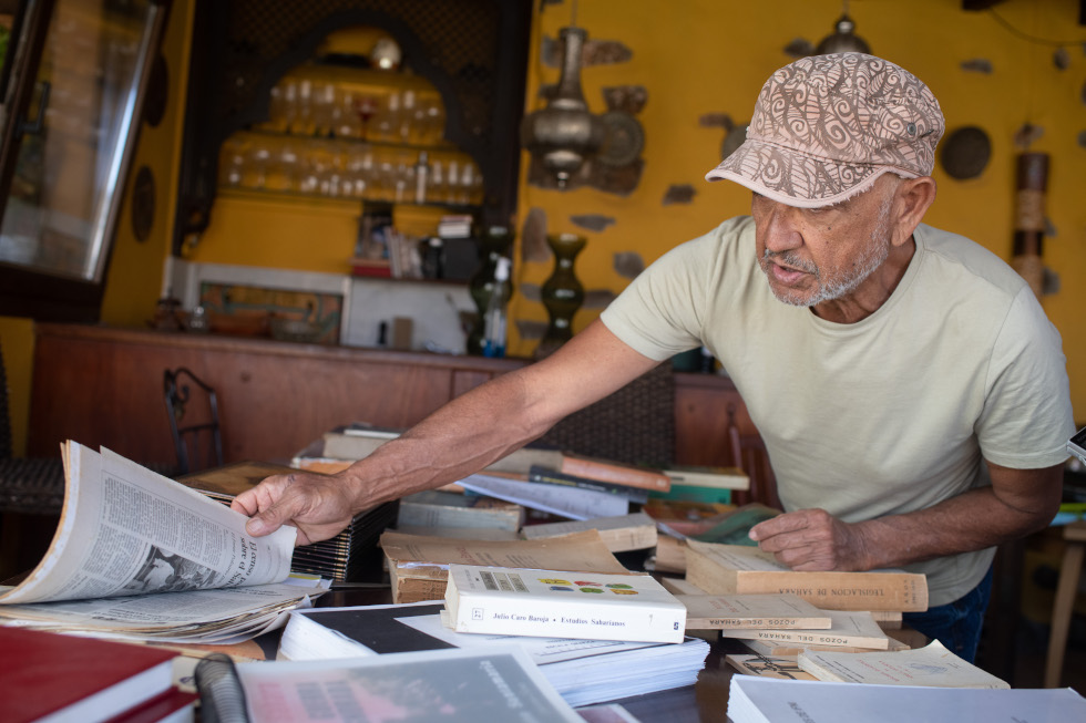 Muestra orgulloso algunos de los más de 300 libros que se apilan en estanterías y cajas de cartón. La mayoría son del Sáhara. Poco a poco, empiezan a aparecer sorpresas: un diccionario español-bamarani, el dialecto de Ifni; una legislación del Sáhara de los años 1965 a 1973; libros como Los pozos del Sáhara de Pedro Gómez Moreno; un manual de historia Santa Cruz de Mar Pequeña Ifni-Sahara del militar Tomás García Figueras con un interesante apéndice fotográfico con imágenes de la ocupación de Ifni o las memorias en el desierto del militar y administrador colonial español Francisco Bens de 1947.