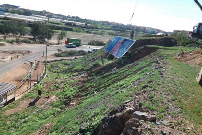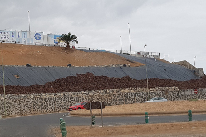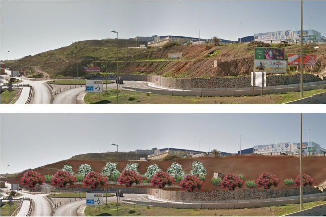 En ese escenario, las primeras obras han consistido en retirar todas las vallas publicitarias, suavizar las pendientes y mejorar así su estabilidad, reperfilar todo el talud, rellenar los hoyos y colocar escollera en su base. Posteriormente, se ha instalado una malla anti hierba que facilita su conservación, se ha cubierto con rocalla volcánica y grava, se ha instalado un sistema de riego y se han plantado cardones, buganvillas y adelfas.