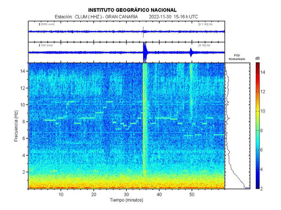 La Red Sísmica Canaria, operada por Involcan, ha registrado a las 15:35 horas una señal sísmica en Gran Canaria originada por el paso de una potente onda acústica a través de la isla.