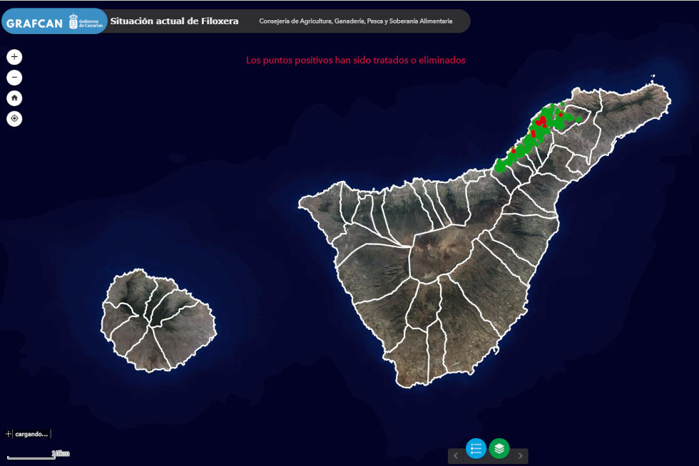 La Consejería de Agricultura, Ganadería, Pesca y Soberanía Alimentaria del Gobierno de Canarias a través de GRAFCAN ha publicado un mapa de acceso libre que refleja en tiempo real las zonas de actuación para el control y erradicación de la filoxera de la vid en la islas, en cumplimiento de las medidas recogidas en la Orden de 20 agosto de 2025, publicado hoy en el Boletín Oficial de Canarias (BOC), por la que se declara la existencia de la plaga “Daktulosphaira Vitifoliae Fitch” por un foco localizado en la comarca de Acentejo, en Tenerife, se califica de utilidad pública la lucha contra dicho insecto y se adoptan las medidas fitosanitarias urgentes de erradicación y control para evitar su propagación.