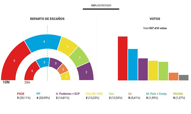 El PSOE ha ganado las elecciones generales al Congreso en Canarias con cinco diputados, sin avances respecto a abril, mientras que el PP sube un escaño y Vox gana dos, con el cien por cien de los votos escrutados.