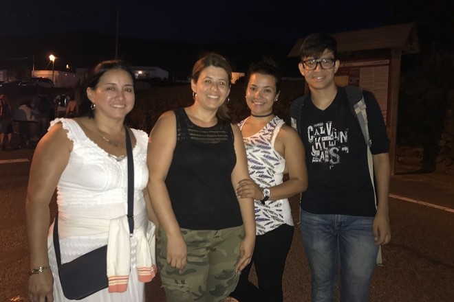 Otro grupo de amigos que llegaba a la localidad al anochecer tras iniciar la caminata a media tarde desde Antigua. En el grupo una vecina de Lanzarote destaca la magia que rodea a esta fiesta: "Me ha encantado la gran cantidad de gente que viene a este lugar tan bello y el buen ambiente", afirmó. "Nos gusta porque se camina hasta el templo, y hemos salido de día para ver el camino por la montaña que es muy lindo, y tiene mucho encanto la ermita y la imagen de la Virgen" describe emocionada, Ana Patricia Checa. "Hemos caminado todos los amigos juntos Viana, Angélica y Raúl de Puerto del Rosario, aunque todos procedemos de América del Sur. Unos bocadillos y agua, paso suave, alguna parada y mucha ilusión para llegar a la cima", apunta la joven.