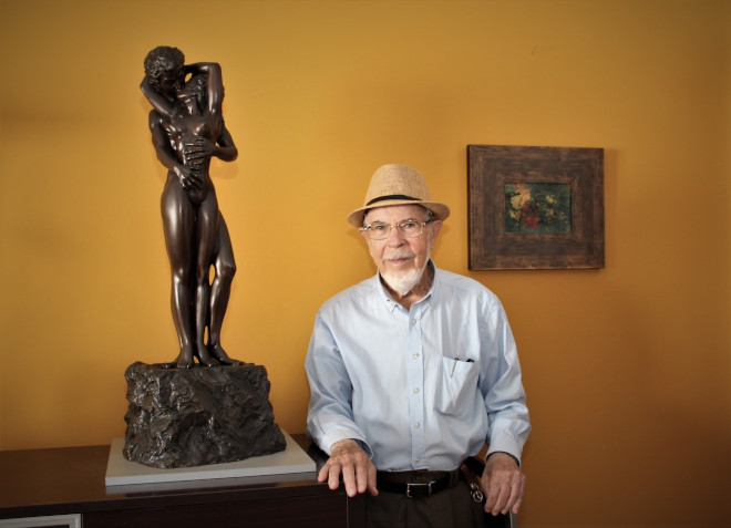 En casa de su hijo Alfredo posa orgulloso junto a la escultura del beso y otras obras pictóricas que ha regalado al matrimonio. Enfrente contempla su Marilyn, que se la dañaron al pasar la aduana a su regreso de Colombia, como muchos otros enseres, en busca de algún tesoro oculto, cuando el verdadero tesoro estaba siendo ultrajado a manos de los funcionarios.