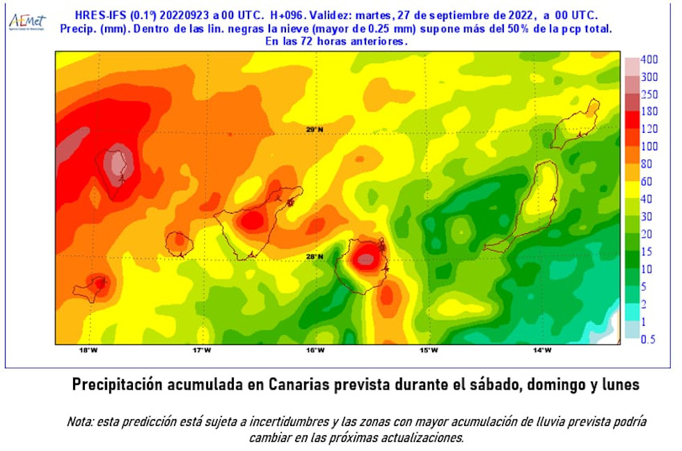 El domingo 25 se espera una intensificación de las precipitaciones que pueden ser muy fuertes (hasta 30 litros por metro cuadrado en 1 hora) con acumulaciones de 100 litros por metro cuadrado en 12 horas, excepto en Lanzarote y Fuerteventura donde se prevén hasta 40 litros por metro cuadrado cada 12 horas.
