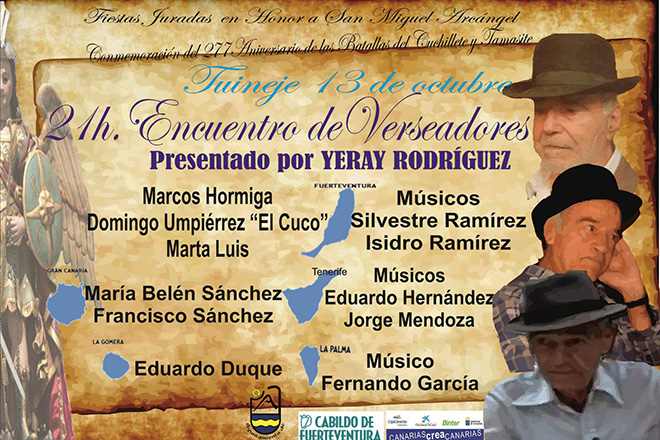 La Concejalía de Cultura del Ayuntamiento de Tuineje, que dirige Lolina Negrín, organiza el próximo viernes 13 de octubre, a partir de las 21:00 horas en la Plaza de Tuineje, un encuentro de verseadores llegados de Gran Canaria, La Gomera, Tenerife, La Palma y Fuerteventura, presentado por Yeray Rodríguez.