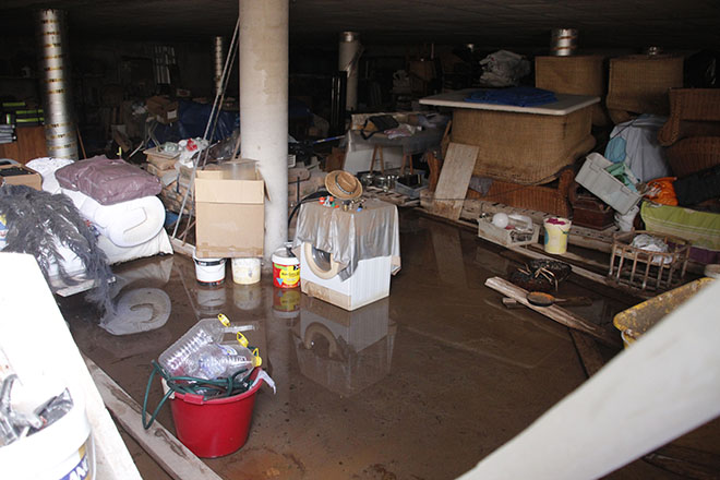 En El Palmeral, Luis muestra su propio sótano anegado, que usaba a modo de almacén y ha visto como esta filtración ha provocado el deterioro de todos sus enseres. A diario tiene que achicar el agua de un sótano en el que tenía intención de montar un gimnasio.