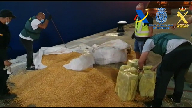 La cocaína estaba escondida entre las casi 3.500 toneladas de millo que transportaba el navío, que tenía por destino Cádiz, tras una escala prevista en Las Palmas de Gran Canaria, añade la Agencia Tributaria.