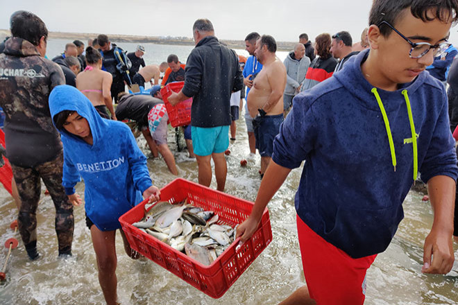 El resultado de esta operación ancestral fueron hoy más de treinta cajas de pescado, salemas en su mayor parte, por encima de una tonelada. Y la faena no saldría adelante sin la colaboración de todos. Y de todas, porque ya no participan únicamente sacando el pescado en tierra y arreglándolo después, sino que cada vez son más las mujeres que se echan al agua para ayudar con el chinchorro.