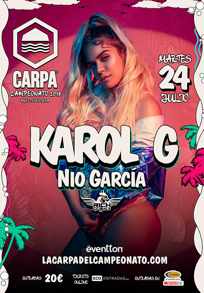 La Carpa del Campeonato de Fuerteventura 2018 celebra este martes uno de los conciertos más esperados del verano. La diva de la música urbana, Karol G, y la estrella revelación del trap, Nio García, se subirán al escenario de Sotavento para hacer bailar al público asistente los éxitos más destacados del momento.