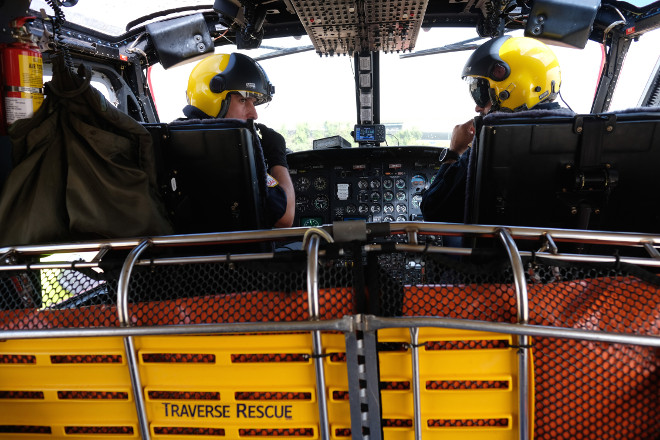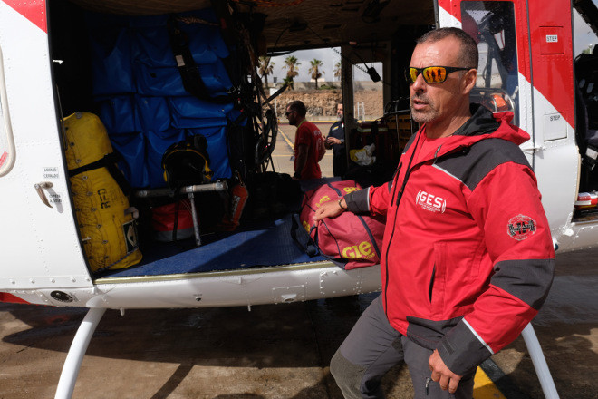 “Lo principal es saber el lugar de la intervención o si es en el mar o en tierra, porque los rescatadores se tienen que preparar de forma diferente, con la ropa de neopreno o de montaña”, explica el piloto. “Arrancamos y durante el camino nos dicen el tipo de servicios, número de afectados. Somos un equipo multitarea con personal especializado, que puede acudir a evacuar a un humano o animal”, describe el piloto.