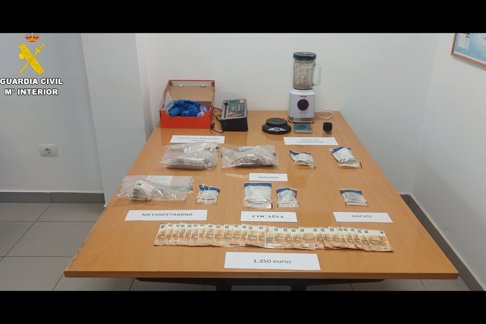 Ante esta circunstancia, la Guardia Civil pudo motivar así la autorización judicial para practicar una entrada y registro en la vivienda del supuesto autor el pasado día 8 de marzo, interviniendo 1.078 gramos de heroína dispuestas en cuatro bolsas plásticas, 3,66 gramos de cocaína dispuesta en dos bolsas, 145,38 gramos de metanfetamina dispuestas en dos bolsas, 12,9 gramos de hachís, y 23,03 gramos de sustancia en polvo sin determinar, pesos exactos realizados posteriormente por el área de sanidad, 1.350 euros en billetes de 50 euros, útiles para la distribución de drogas tales como básculas de precisión, batidora utilizada para la elaboración de sustancias estupefacientes y empaquetadora.