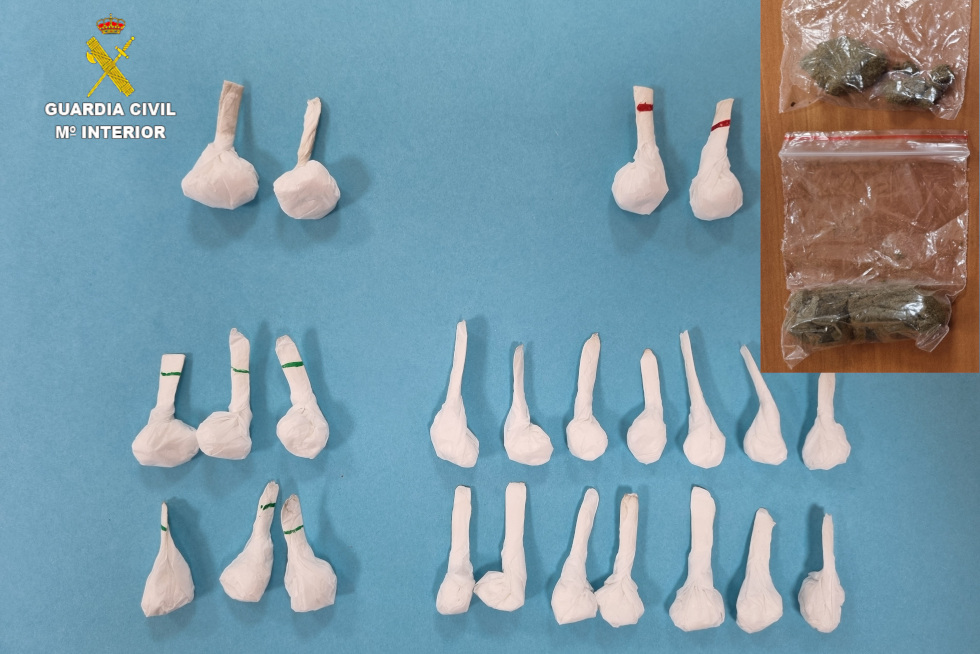 Una vez en dependencias policiales y al procederse al cacheo superficial del detenido y sus pertenencias, se encontró oculto entre sus ropas una bolsa de plástico que contenía 24 envoltorios de plástico blanco que contenían un total de 14 gramos de presunta cocaína.