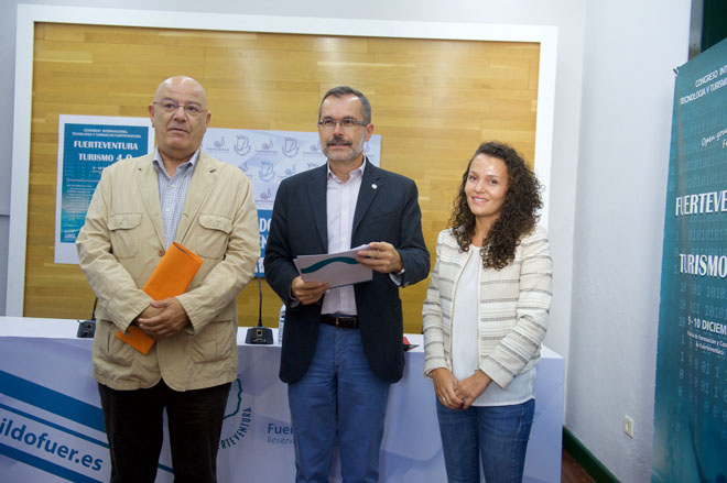 El presidente del Cabildo de Fuerteventura, Marcial Morales, la consejera de Transparencia y Nuevas Tecnologías, Ylenia Alonso, y el presidente de la Asociación de Empresarios Turísticos de Fuerteventura (Asofuer), Antonio Hormiga, presentaron esta convención que persigue, entre otras acciones, "dar las claves para aplicar la tecnología al alcance del sector a la industria turística de la Isla", según coincidieron en señalar.