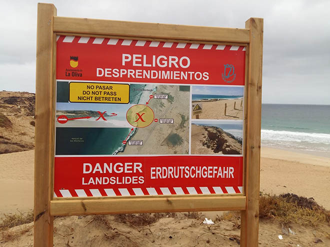 Nota: "Desde el Ayuntamiento de La Oliva queremos pedir disculpas por los errores en el cartel de desprendimientos en Piedra Playa, que ya se encuentran corregidos. El error se produjo en la coordinación entre el Ayuntamiento y el Cabildo, dando por hecho ambas partes que la traducción del borrador ya estaba hecha. No ha sido un error de traducción, sino que la traducción no se llegó a realizar hasta ahora. Agradecimientos a los ciudadanos y entidades que nos han advertido del error, y a la Concejalía de Turismo de La Oliva".