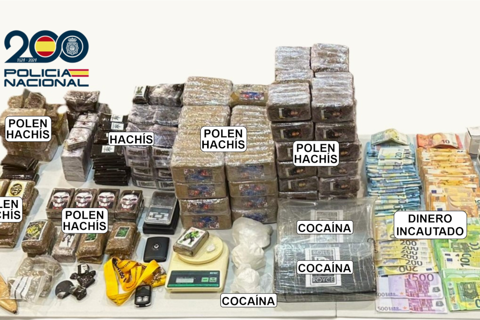 Se realizaron tres registros donde se incautaron un total de dos kilos de cocaína, 34 kilos de polen de hachís, nueve kilos de hachís, anabolizantes, 37.000 euros en efectivo y dos vehículos
