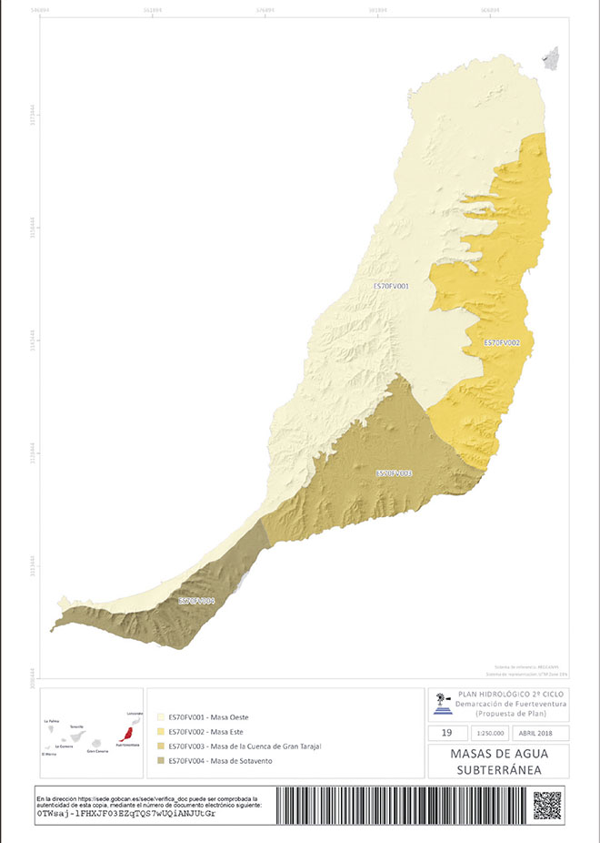 En Fuerteventura se identifican cuatro masas de agua subterráneas: la masa Este, la masa Oeste, la de la Cuenca de Gran Tarajal y la de Sotavento de Jandía. Todas se encuentran en mal estado en cuanto a la calidad de sus aguas. Las dos primeras, la Este y la Oeste se encuentran en estado de riesgo químico alto “debido a los niveles de nitratos registrados”.