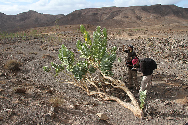 En 1884, la viajera inglesa Olivia Stone llegó a Puerto Cabras y se sorprendió al ver una planta que crecía por todas partes y era prácticamente lo único verde en la ciudad. Se trataba del tabaco moro o palero. Hasta 1869, le explicaron entonces, era una especie absolutamente desconocida en la Isla. “De repente, apareció por todas partes”, recuerda en su libro de viajes. Había llegado como planta ornamental de Sudamérica, mezclada con las semillas de tabaco que se traían a las plantaciones tabaqueras de Canarias. Ahora es un arbusto tóxico que crece por toda Fuerteventura (y Canarias), tanto junto al mar como en los altos de Jandía. No se lo comen ni las cabras.