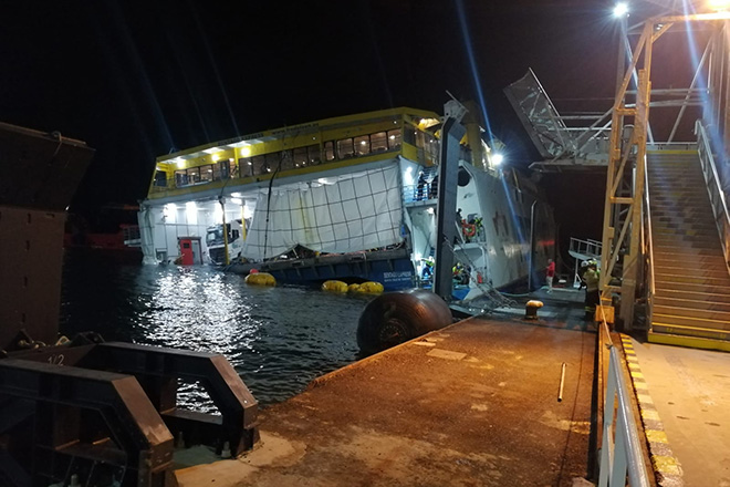 Con el catamarán amarrado al muelle desde donde habitualmente opera, la naviera va a proceder a hacer una inspección submarina del casco, para observar los daños que ha sufrido.