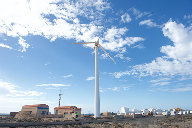Calero explica que se realizaron reuniones previas con los vecinos para estudiar sus demandas y adaptar así el proyecto a esas necesidades, lo cual finalmente se tradujo en el diseño de un sistema híbrido eólico-diésel que incluyó un aerogenerador de la marca Vestas de 208 kilovatios de potencia, dos grupos electrógenos diésel auxiliares de 125 kilovatios, una planta desaladora de agua de mar de 50 metros cúbicos, una depuradora, una fábrica de hielo con capacidad de producir hasta 200 kilos al día, y un frigorífico para almacenar hasta 500 kilos de hielo y pescado.