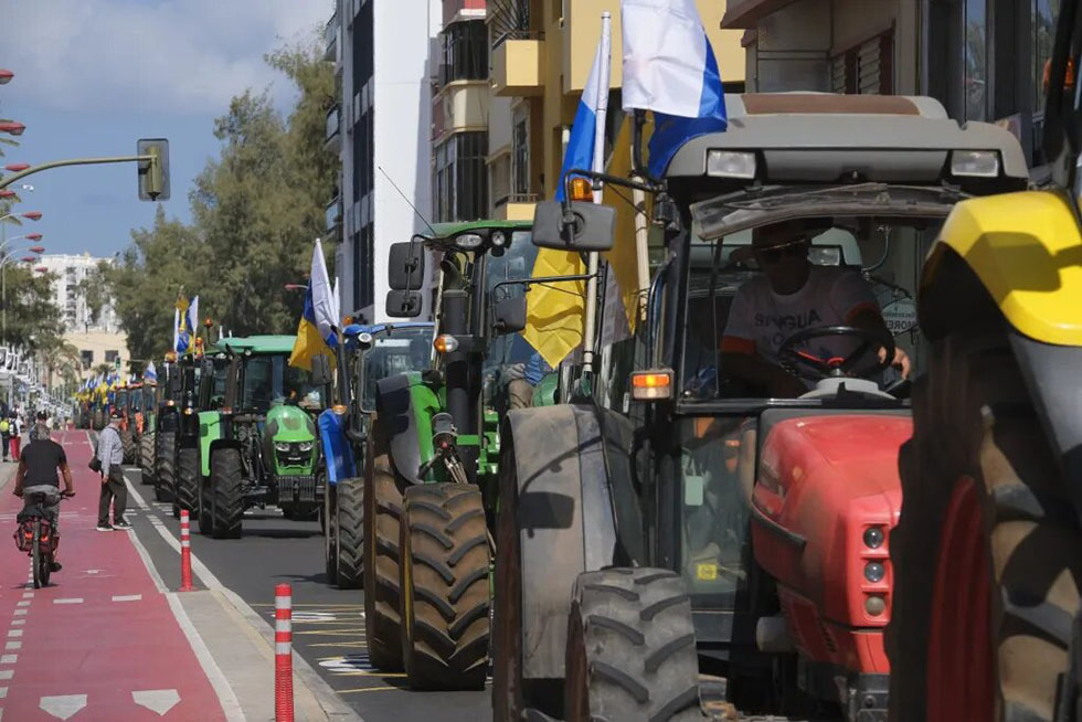 Ochenta y un tractores de San Mateo, Teror, Santa Brígida, Gáldar, Moya, Guía y Tejeda han exigido este miércoles en Las Palmas de Gran Canaria la supervivencia del sector en una protesta aplaudida por numerosos ciudadanos, que se han llevado como obsequio plátanos y tomates gratis, y que ha tenido momentos de roce con un grupo de negacionistas del cambio climático.