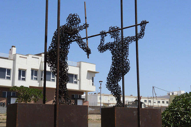 Por su parte, ‘El juego del palo’ es obra de Amancio González y realizada en hierro. La escultura es un homenaje al ancestral juego aborigen del Palo canario. Está situada en la zona ajardinada comprendida entre las calles Tenerife y Bentejuí, en Fabelo.