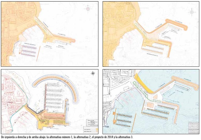 Hay tres alternativas más. La primera, la más barata (12,6 millones) supone prolongar el dique de abrigo en cuarenta metros, ampliar la explanada en noventa metros y formar dos atraques de 90 y 150 metros, crear una marina deportiva con los actuales pantalanes y tres más flotantes, abrir una pasarela de conexión y construir un dique flotante de 162 metros para proteger la nueva zona de amarre, que tendría 204 puestos.