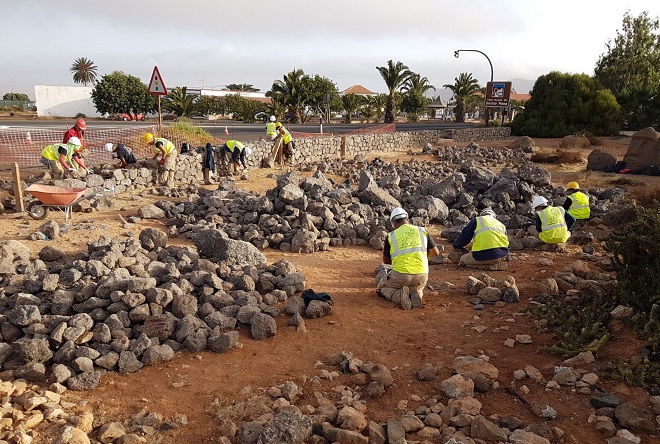 Un grupo de quince alumnos-trabajadores del Proyecto de Formación en Alternancia con el Empleo PFAE 'Construyendo futuro' han finalizado la construcción de los muros de piedra del lateral de la carretera FV-20 en su paso por el pueblo de Ampuyenta, en el municipio de Puerto del Rosario. Los alumnos, cuya especialidad es la colocación de piedra natural, comenzaron estos trabajos el pasado mes de mayo.