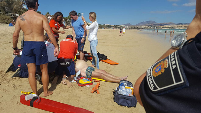 Ya en tierra, se comprobó que el afectado, de nacionalidad alemana, se encontraba en parada cardiorrespiratoria, por lo que otros socorristas y otros bañistas comenzaron a practicarle maniobras de reanimación cardiopulmonar hasta la llegada de la ambulancia.