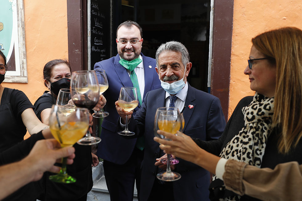 El presidente de Cantabria llegó pronto, siempre acompañado por su colega de Asturias, Adrián Barbón, y ya antes del homenaje empezó su ronda de selfies y fotos. Y no olvidó regalar una lata de anchoas de Santoña a la Vinatería Albillo, en cuya carta está precisamente el manjar del mar Cantábrico.