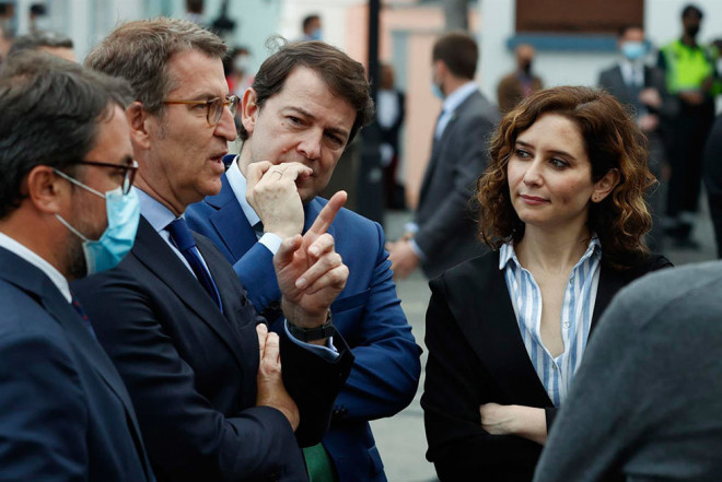 Isabel Díaz Ayuso también fue recibida con vítores de presidenta antes del homenaje, y después se la vio salir un paso por detrás cuatro barones del PP.