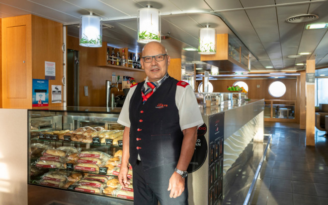 Fue un cliente habitual del mercado quién le sugirió que realizara los cursos requeridos para acceder a la plaza. Había hecho la promesa de que si conseguía el puesto de trabajo iría a agradecérselo a la Virgen del Pino en Teror. “Estaba necesitado en ese momento y fue una bendición”, relata. Agradece a la naviera la oportunidad que le brindó y lo bien que le han tratado desde entonces, consciente de que ha sido algo recíproco: “Yo también he respondido. Esto tienes que llevarlo en la sangre. Para mí es trabajo y relax, porque el mar me relaja. Además, atender al público es lo que he mamado desde chiquito. A nosotros nos dan un mes de vacaciones y cuando ya llevo veinte días quiero volver a embarcarme. Lo echo de menos, pero porque me gusta”.