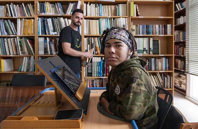 El caso de Anthony es el de la lucha contra los elementos. Estudiante de Bachillerato Artístico en Artes Plásticas, que solo se imparte en la Isla en la escuela Pancho Lasso, ha conseguido, de momento, que las clases de su plan de estudios se impartan en la planta baja del centro. Para ello ha habido que adecuar la biblioteca del centro que, obviamente, permanece cerrada al público en horario lectivo.