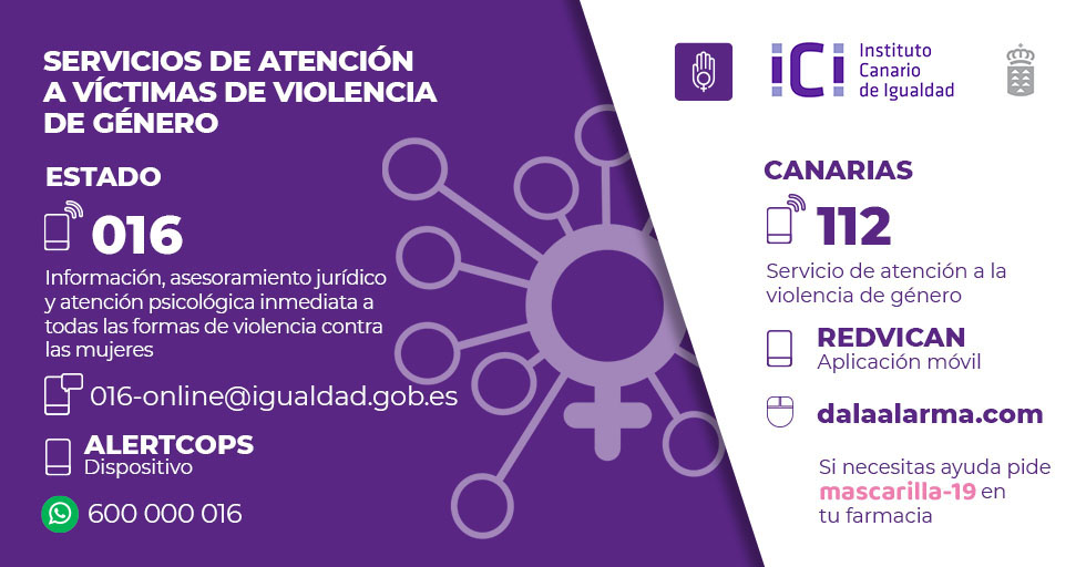Ante cualquier duda o necesidad de información en materia de violencia de género se puede consultar la Red de recursos que el ICI mantiene en convenio con el resto de administraciones en todas las islas, estos son gratuitos, confidenciales y no es necesario contar con una denuncia previa para acudir a ellos en busca de ayuda o información, sea cual sea su situación, circunstancias o nacionalidad.