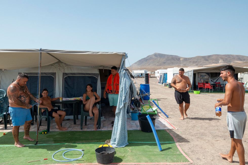 Con simpatía, Antonio recuerda cómo antes venía a Papagayo el panadero, el pastelero o el del hielo. “Poco a poco se ha ido perdiendo todo”, dice, y para lo más básico hay que salir del camping. En su parcela se respira alegría. Las tareas de la familia están definidas. Los niños van a pescar y, si se da bien, reparten las capturas con los vecinos. Antonio se encarga de la cocina mientras su mujer va a trabajar a un hotel de Playa Blanca todos los días. Opina que cada año, a los campistas, les ponen “un impedimento más” para que la gente no venga. Menciona la poca, mala o nula señal telefónica que hay, dependiendo del momento. “Tengo que subir a la montaña para recibir los WhatsApp, porque no hay cobertura”, relata. Aunque eso, a veces, es de agradecer.