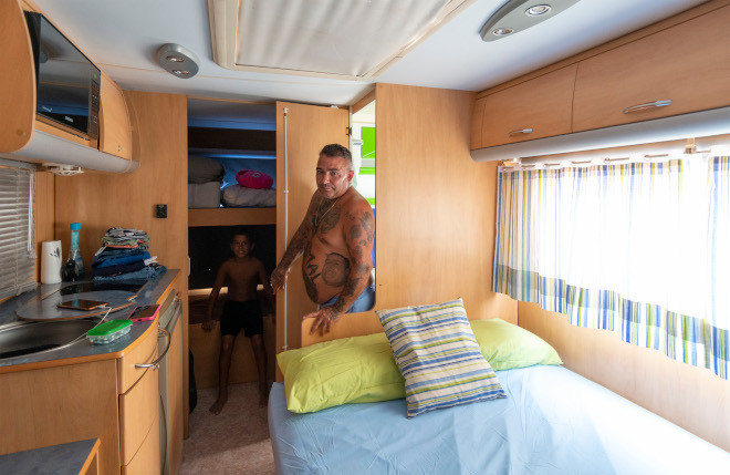 Tiene una caravana por todo lo alto: la caravana en sí, el avance y el sobreavance. El vehículo derrocha comodidades. Todos duermen en la caravana, en camas grandes. Tiene tres literas de dos metros, una cocina equipada, nevera, lavadora y una terraza donde la familia pasa la mayor parte del tiempo. Una alfombra con forma de azulejos evita que los pies vayan transportando la arena hacia el interior. Son familia numerosa, pero si hay una visita “inesperada” también tienen disponible una cama plegable.
