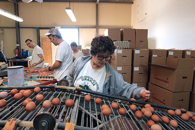 Otra medida que, visto desde el mundo empresarial, parece contraproducente, es la búsqueda de maquinaria manual, en lugar de tecnología puntera. “Precisamente lo que queremos es mano de obra, así que buscamos las clasificadoras de huevos más antiguas que hay en el mercado, para que nuestros chicos puedan llevar a cabo la colocación de los huevos, uno a uno, en sus cartones y, después, en las cajas”, reitera la gerente de Adisfuer, que asegura que con la tecnología actual la granja entera “podría ser llevada por dos personas”.
