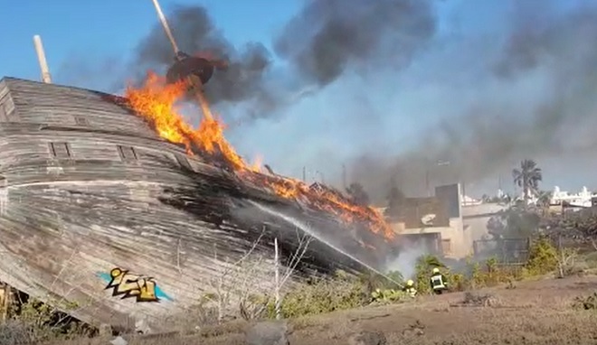 Un incendio ha arrasado este martes por la tarde con un barco del parque de ocio Baku, en la avenida Nuestra Señora del Carmen de Corralejo.