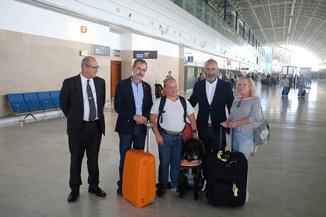 Tras atender a los medios de comunicación, Thorsten Veldenzer, su madre ysu perro guía, Frazier, caminaron hacia la puerta del Aeropuerto dispuestos a disfrutar de unos días de vacaciones en Fuerteventura.